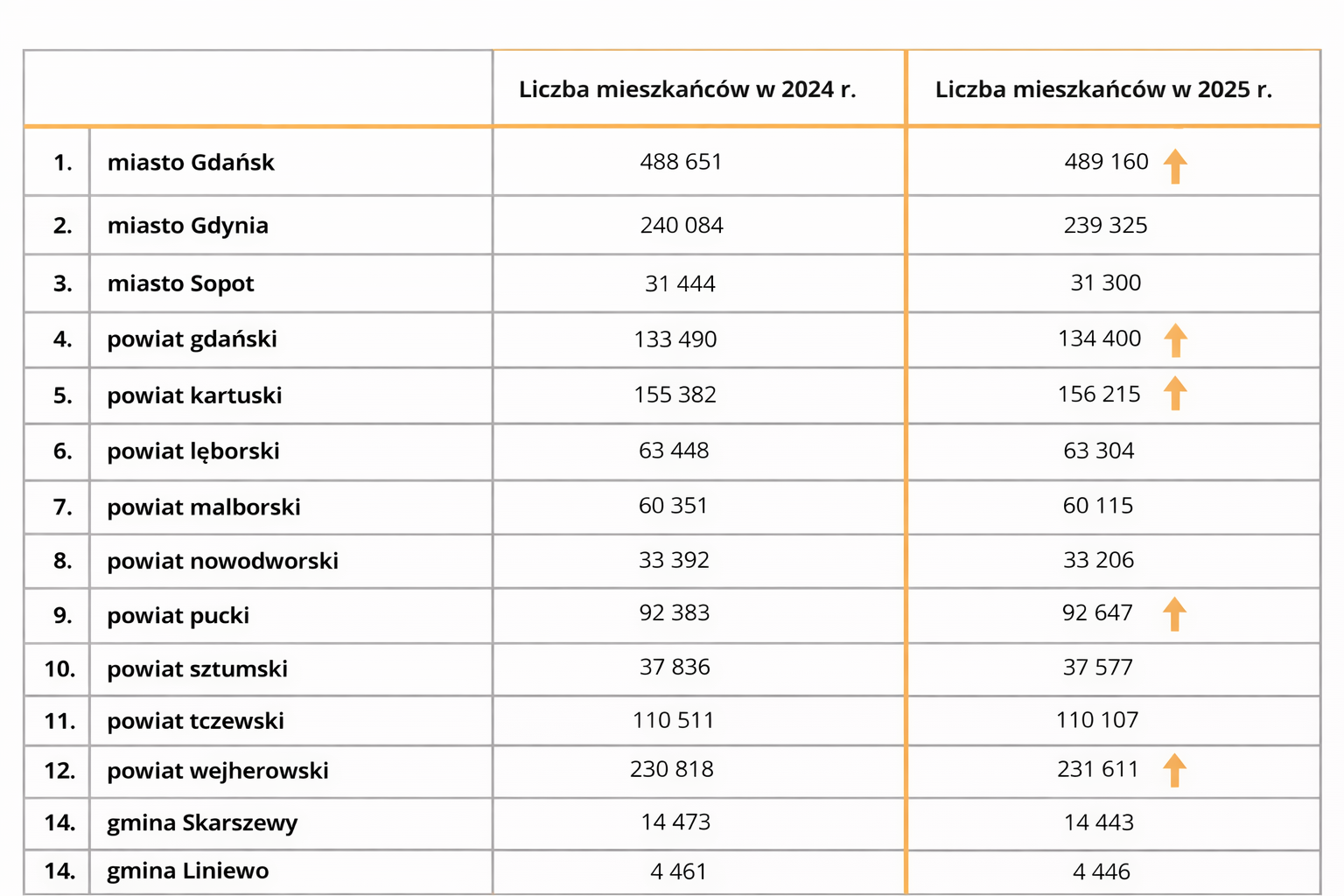 Na kolejnych miejscach pod względem dynamiki wzrostu znalazły się Gdańsk (wzrost o 509 mieszkańców), gmina Kosakowo (wzrost o 412 osób) oraz gmina Szemud (wzrost o 375 osób). Warto podkreślić, że według raportu GUS, Gdańsk zajmuje obecnie 3. miejsce w kraju pod względem wzrostu liczby ludności wśród miast wojewódzkich.